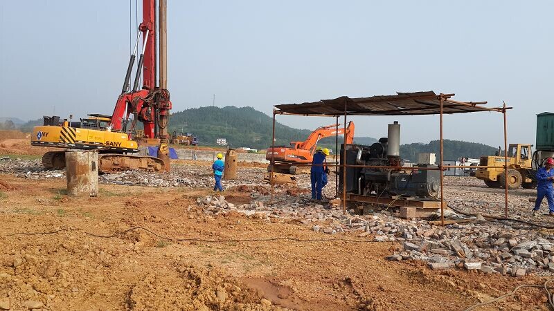 施工內(nèi)容及工程量:灌注樁鋼筋籠制作、運輸及安放,鉆孔樁成孔、商品砼采買、砼灌注。旋挖鉆孔灌注樁樁基工程共完成1244根,樁徑800mm,樁身混凝土強度等級為C30,完成總米數(shù)23458.18米,設(shè)計混凝土方量11791.37方,實際灌注混凝土15624m³,后壓漿共使用900噸復(fù)合硅酸鹽水泥,加工鋼筋791.56t。