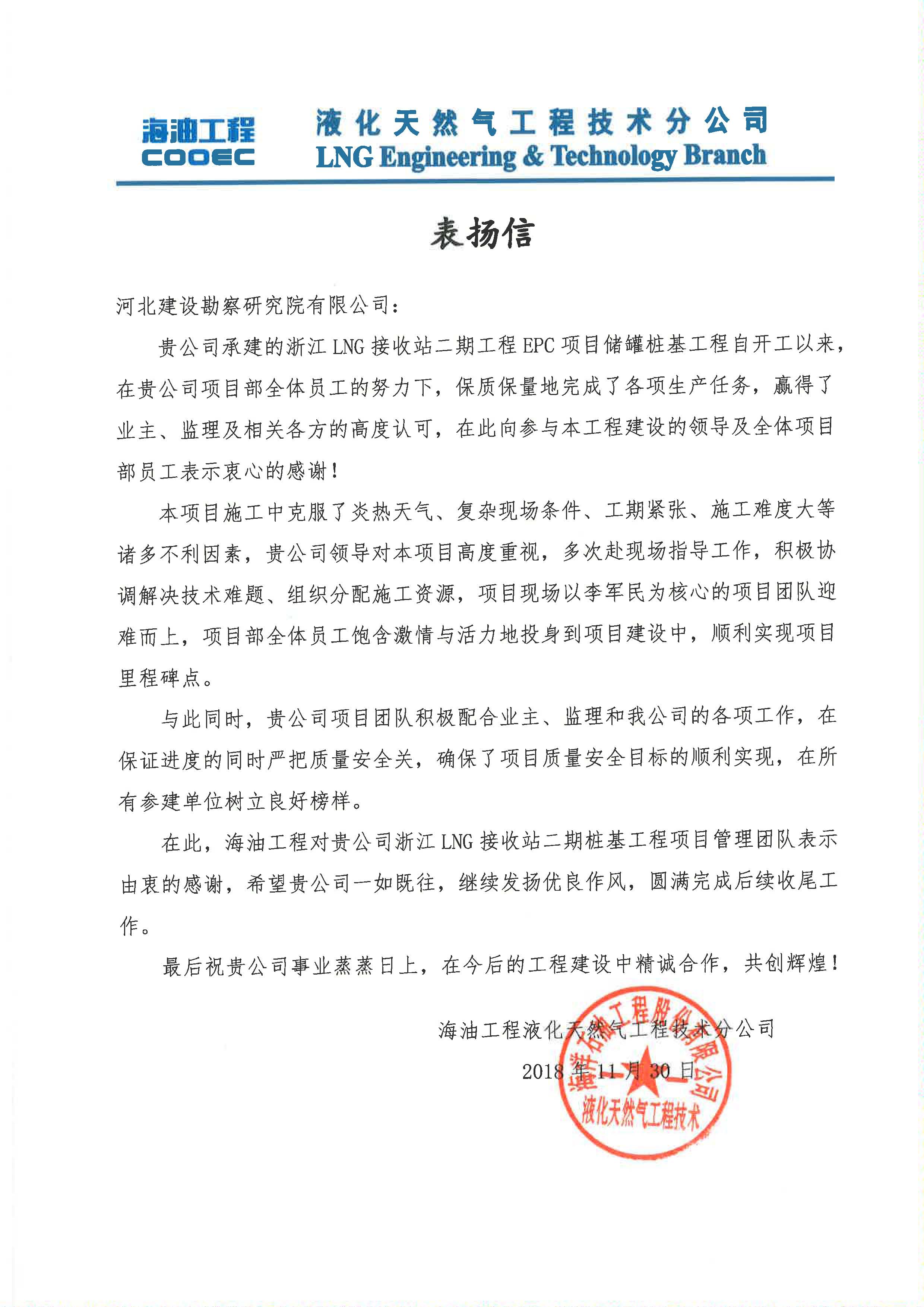 近日我公司浙江LNG接收站二期工程EPC項目儲罐樁基工程項目部收到業主發來表揚信。