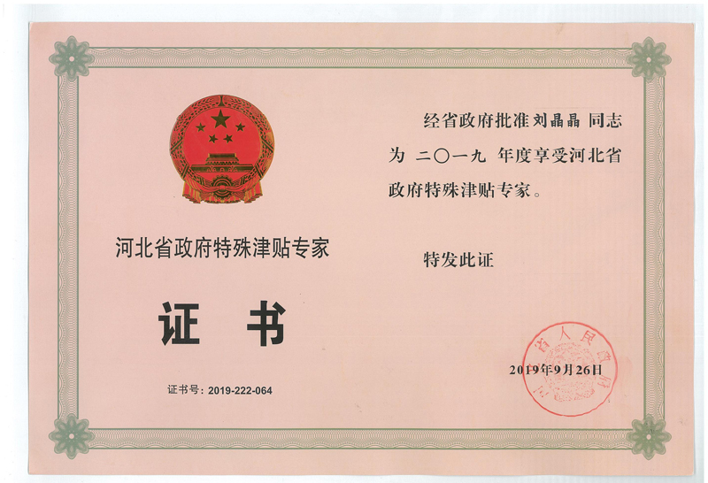 經公司組織申報,石家莊市人民政府推薦,省人力資源和社會保障廳評審,省政府同意,公司劉晶晶同志榮獲省政府特殊津貼專家稱號。