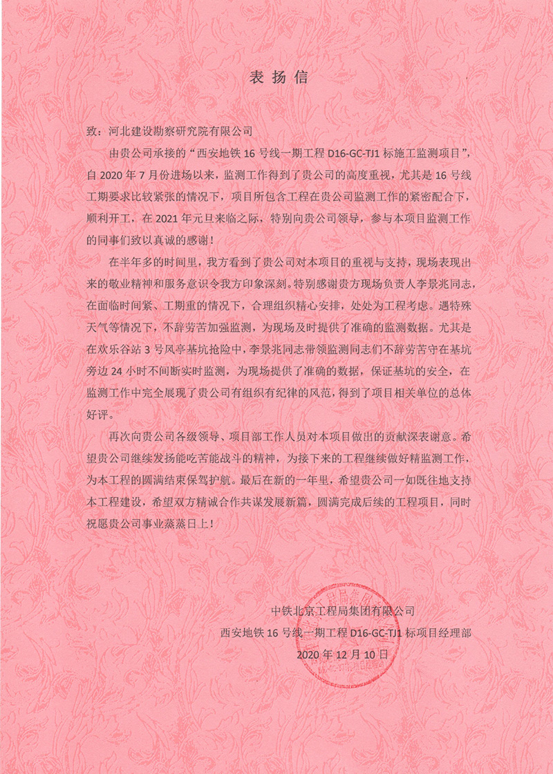 近日,公司收到中鐵北京工程局集團(tuán)有限公司西安地鐵16號線一期工程D16-GC-TJ1標(biāo)項目經(jīng)理部的表揚信。