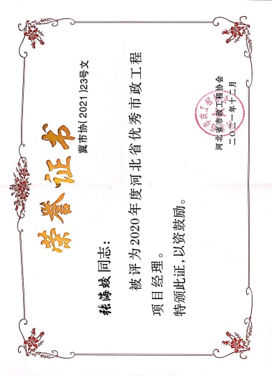 近日,由河北省市政工程協會評選,公司榮獲“2021年度河北省優秀市政施工企業”稱號;韓立君董事長榮獲“2021年度河北省市政行業優秀企業家”稱號;孫運青、狄艷林、高軍會、張海蛟四位同志榮獲“2020年度河北省優秀市政工程項目經理”稱號。