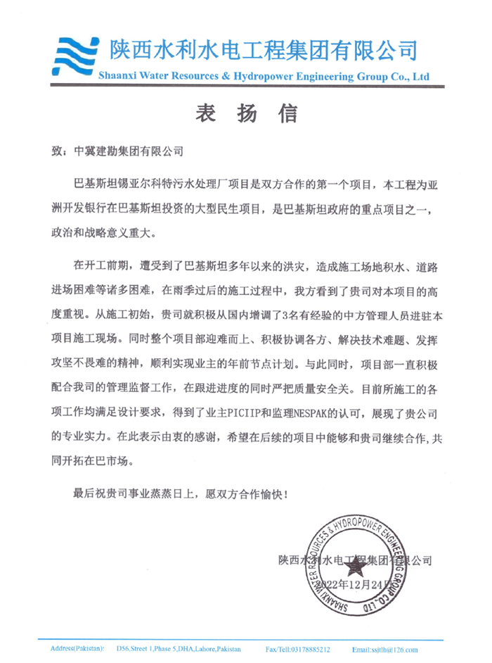 巴基斯坦錫亞爾科特污水處理廠項目是我方和陜西水利水電工程集團有限公司合作的第一個項目,是亞洲開發銀行在巴基斯坦投資的大型民生項目,是巴基斯坦政府的重點項目之一,政治和戰略意義重大。在工程前期,遭受到了巴基斯坦多年以來的洪災,造成施工場地積水、道路進場等諸多困難。我們整個項目部高度重視,迎難而上、積極協調各方、解決技術難題、發揮攻堅不畏難的精神,順利實現業主的年前節點計劃。目前施工的各項工作均滿足設計要求,得到了業主PICIIP和監理NESPAK的認可,展現了我公司的專業實力。業主希望在后續的項目中能夠和我公司繼續合作,共同開拓巴基斯坦市場。