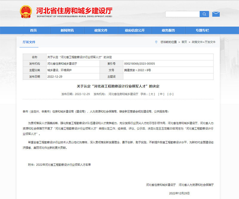 為貫徹落實(shí)人才強(qiáng)冀戰(zhàn)略,強(qiáng)化我省工程勘察設(shè)計(jì)隊(duì)伍建設(shè)和人才競爭能力,充分發(fā)揮行業(yè)頂尖人才的示范引領(lǐng)作用,近日,河北省住房和城鄉(xiāng)建設(shè)廳、河北省人力資源和社會保障廳聯(lián)合印發(fā)《關(guān)于認(rèn)定“河北省工程勘察設(shè)計(jì)行業(yè)領(lǐng)軍人才”的決定》,我公司梁書奇同志被認(rèn)定為“河北省工程勘察設(shè)計(jì)行業(yè)領(lǐng)軍人才”。