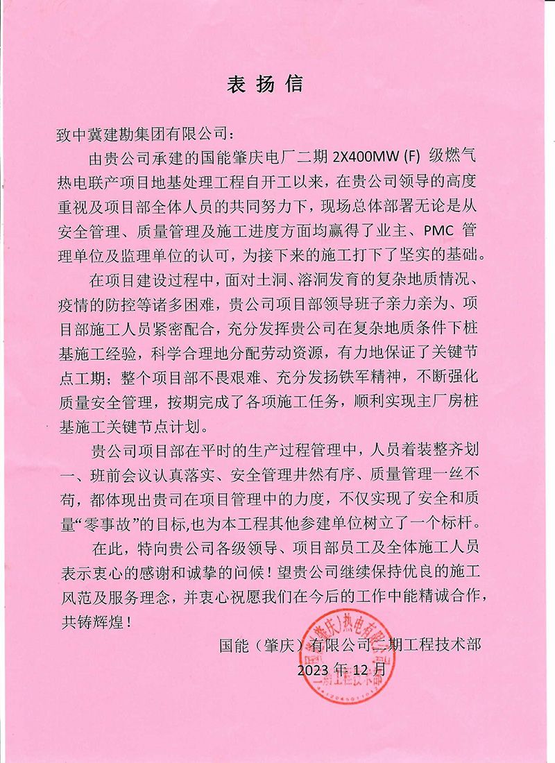 國能肇慶電廠二期2×400MW(F)級燃?xì)鉄犭娐?lián)產(chǎn)項目為二期擴建工程,在總公司及領(lǐng)導(dǎo)們的幫助下攻堅克難,面對土洞、溶洞發(fā)育的復(fù)雜地質(zhì)情況、疫情的防控等諸多困難,充分發(fā)揚鐵軍精神,不斷強化質(zhì)量安全管理,積極配合業(yè)主進度計劃,按期完成了各項施工任務(wù)。我單位在安全管理、施工質(zhì)量管理方面為建設(shè)方、PMC管理單位、監(jiān)理方留下深刻影響,為此項目部得到了國能(肇慶)熱電有限公司的高度認(rèn)可!