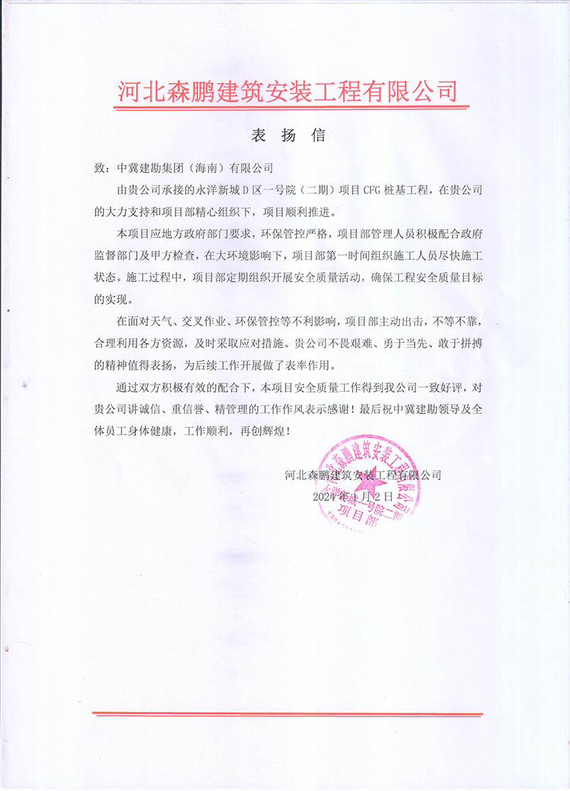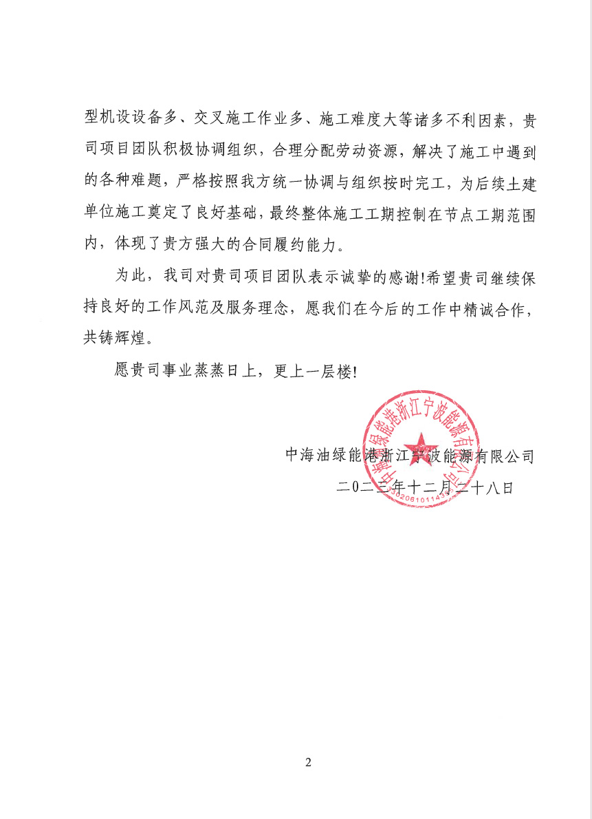連云港榮泰化工倉儲有限公司倉儲罐區(qū)工程(五期)項目二標(biāo)段樁基工程,業(yè)主在表揚信中說:貴公司克服工程建設(shè)中面臨的場地緊張、疫情嚴(yán)、任務(wù)繁重等諸多困難,安全、高效、優(yōu)質(zhì)的圓滿完成了施工任務(wù)。貴公司項目部全體員工克服重重困難,精心謀劃,精心施工。特別是在施工中所表現(xiàn)出的管理水平及敬業(yè)精神,令人欽佩。