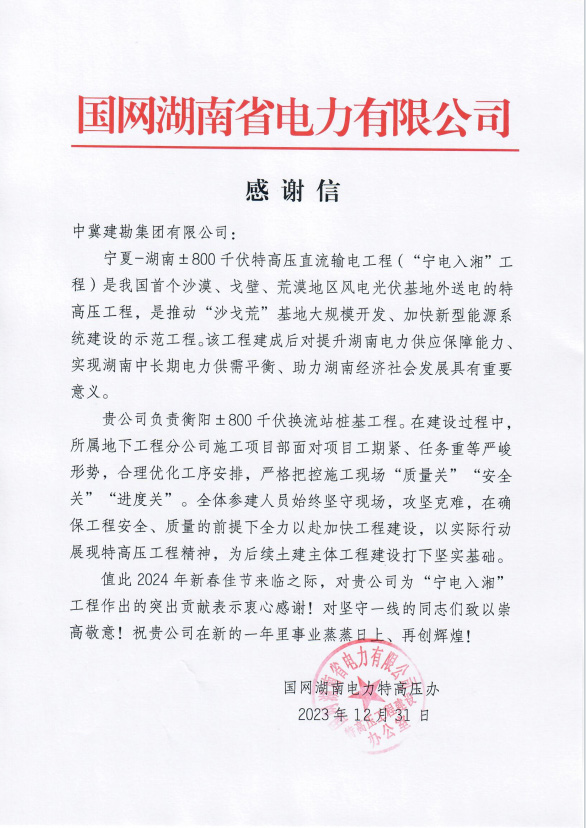 國家電網(wǎng)湖南電力特高壓辦,為我公司承建的衡陽±800千伏換流站工程樁基項目部發(fā)來感謝信一封。感謝信內(nèi)容主要表達了,面對項目的工期緊,任務(wù)重等關(guān)鍵形勢,稱贊我公司能嚴(yán)格把質(zhì)量關(guān),安全關(guān)和進度關(guān)。