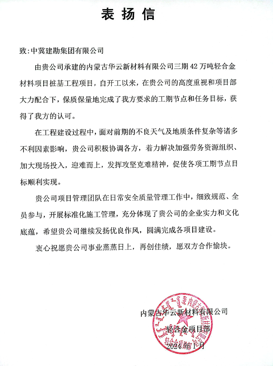 內(nèi)蒙古華云新材料有限公司三期42萬噸輕合金材料項目樁基工程,在工程建設(shè)過程中,面對前期的不良天氣及地質(zhì)條件復(fù)雜等諸多不利因素影響,積極協(xié)調(diào)各方,著力解決加強勞務(wù)資源組織、加大現(xiàn)場投入,迎難而上,發(fā)揮攻堅克難精神,保質(zhì)保量地完成了工期節(jié)點和任務(wù)目標(biāo),獲得甲方的認(rèn)可。
