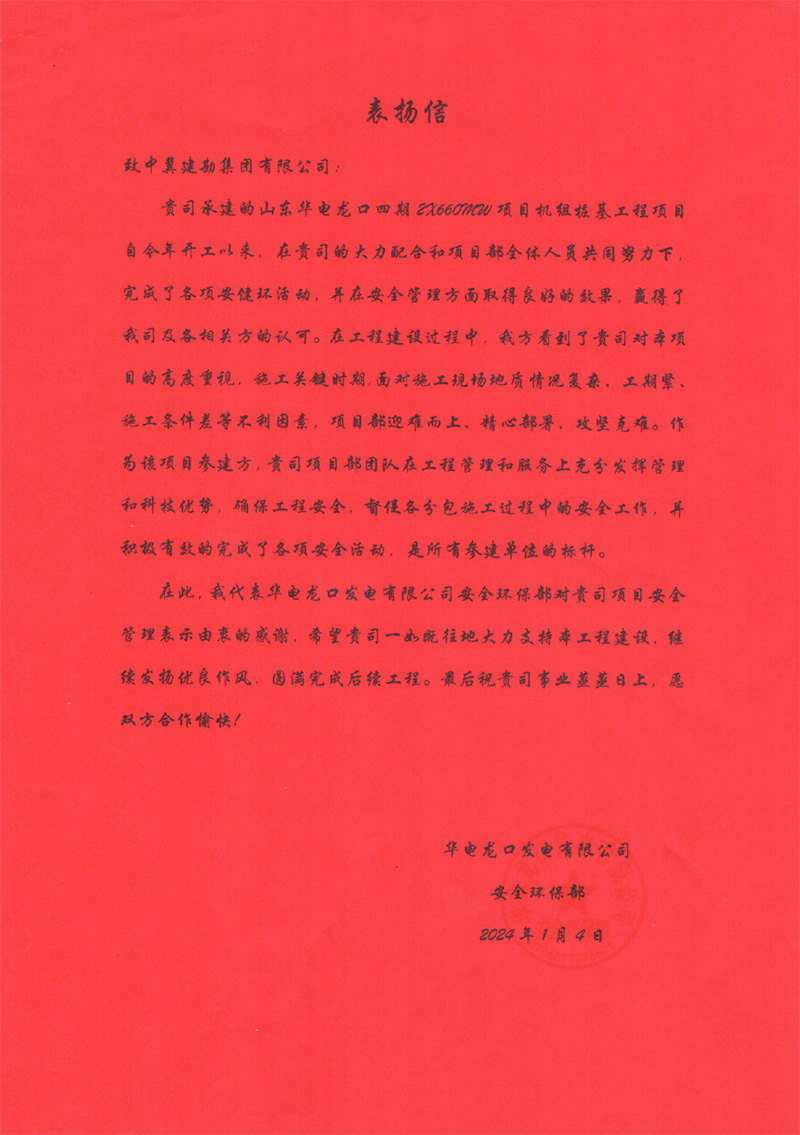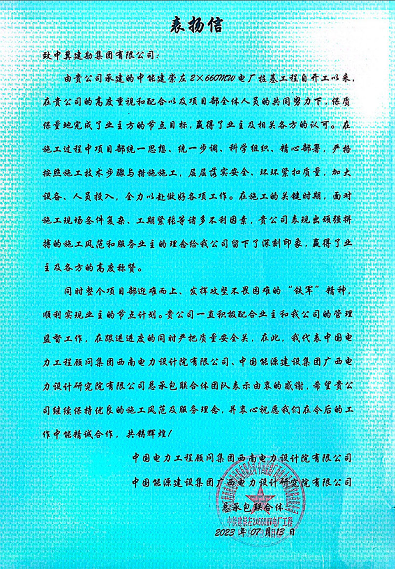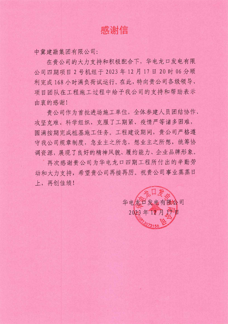 華電龍口發(fā)電有限公司四期項目2號機組于2023年12月17日20時04分順利完成168小時滿負(fù)荷試運行。工程建設(shè)期間,完成了各項安健環(huán)活動,并在安全管理方面取得良好的效果,贏得了業(yè)主方認(rèn)可。我公司人員嚴(yán)格遵守我公司規(guī)章制度,急業(yè)主之所急,想業(yè)主之所想,統(tǒng)籌協(xié)調(diào)資源,展現(xiàn)了良好的精神風(fēng)貌、履約能力、企業(yè)品牌形象。為此,業(yè)主特向我公司各級領(lǐng)導(dǎo)、項目團隊在工程施工過程中給予的支持和幫助表示由衷感謝。