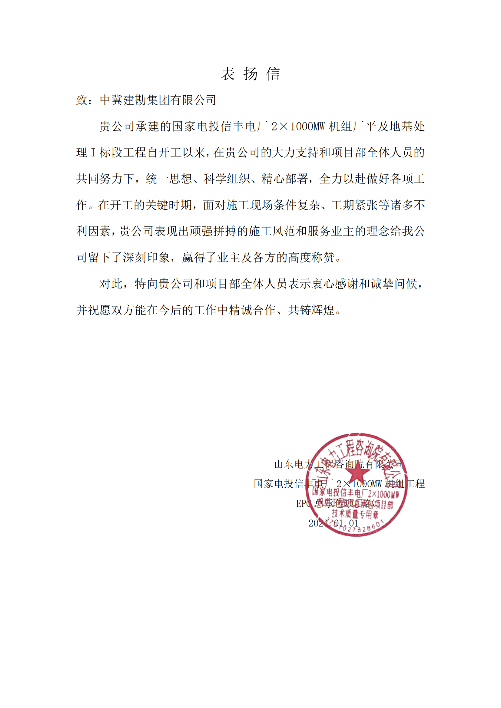 公司收到了國家電網(wǎng)慶陽±800千伏換流站工程由業(yè)主國家電網(wǎng)和監(jiān)理單位河南立新及甘肅光明的聯(lián)合表揚信,表揚信中說在我公司領(lǐng)導(dǎo)的高度重視及項目部全體成員的共同努力下,高標(biāo)準(zhǔn)、高質(zhì)量地完成施工任務(wù),為后續(xù)土建單位施工奠定良好基礎(chǔ),贏得了業(yè)主、監(jiān)理單位的一致認(rèn)可。在施工的關(guān)鍵時期,我單位項目部全體成員迎難而上,精誠協(xié)作,砥礪前行,在風(fēng)雪中有建勘人不屈的脊梁,將建勘人的鐵軍精神發(fā)揮的淋漓盡致!