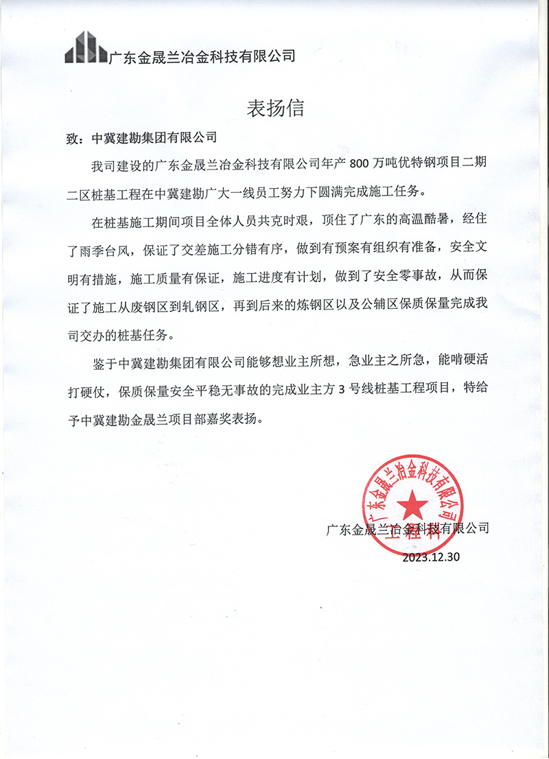 廣東金盛蘭冶金科技有限公司年產(chǎn)800萬噸優(yōu)特鋼項目二期二區(qū)樁基工程,在施工期間項目全體人員共克時艱,頂住了廣東的高溫酷暑,經(jīng)住了雨季臺風(fēng),保證了交差施工分錯有序,做到了預(yù)案有組織有準(zhǔn)備,安全文明有措施,施工質(zhì)量有保證,施工進度有計劃,做到了安全零事故,保質(zhì)保量的完成任務(wù),業(yè)主對項目給予嘉獎表揚。