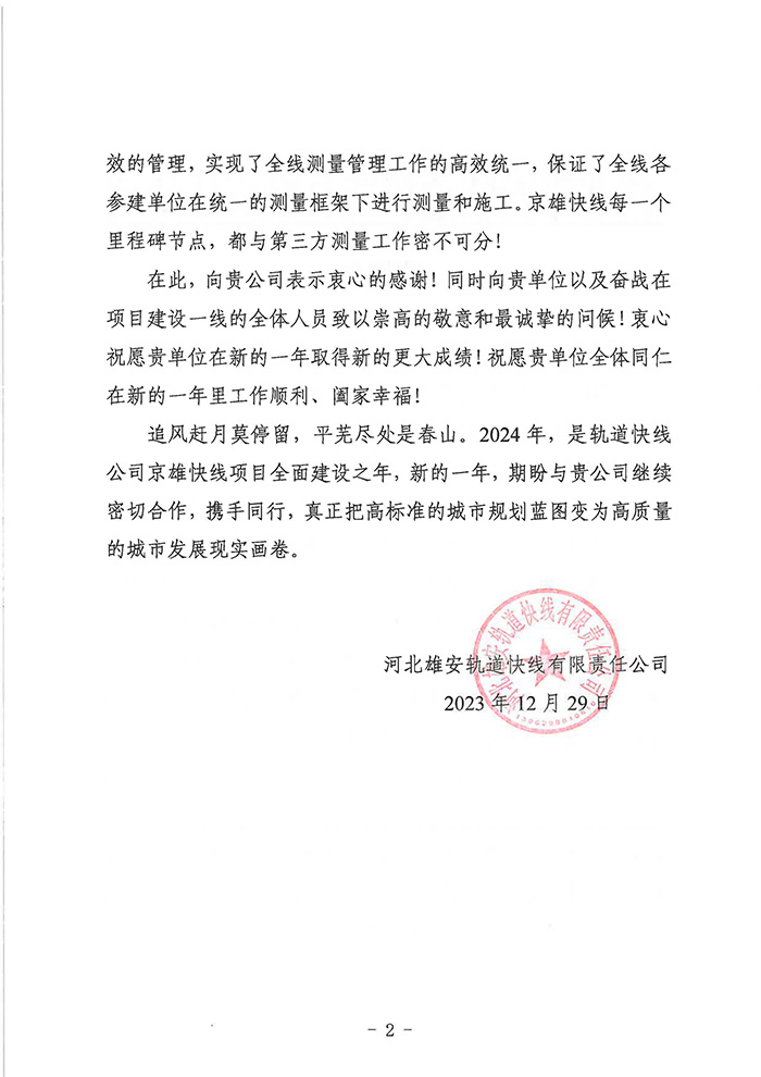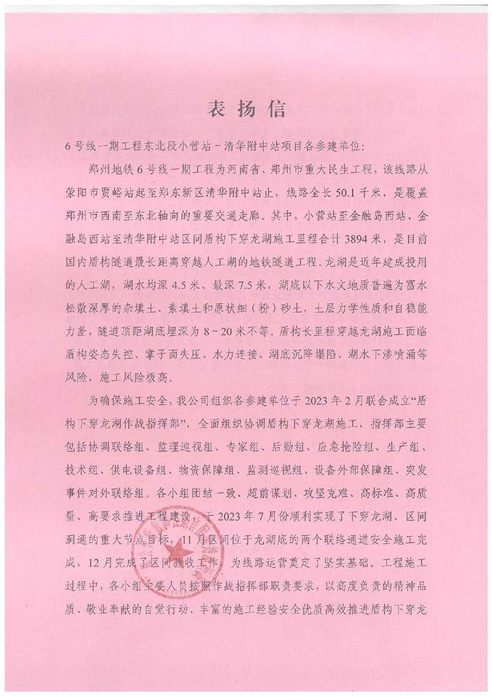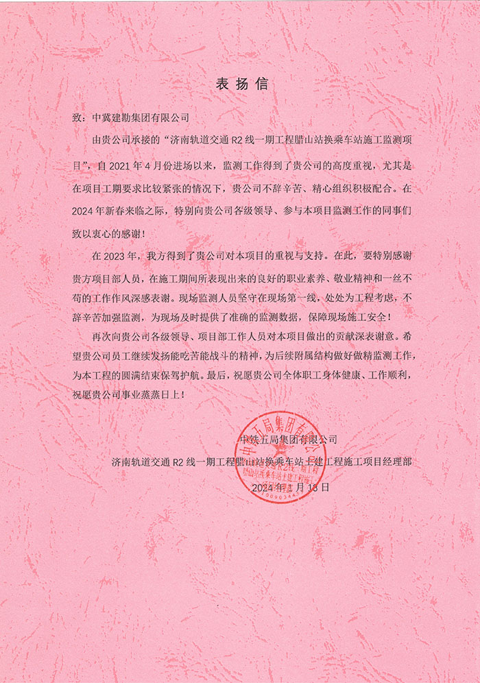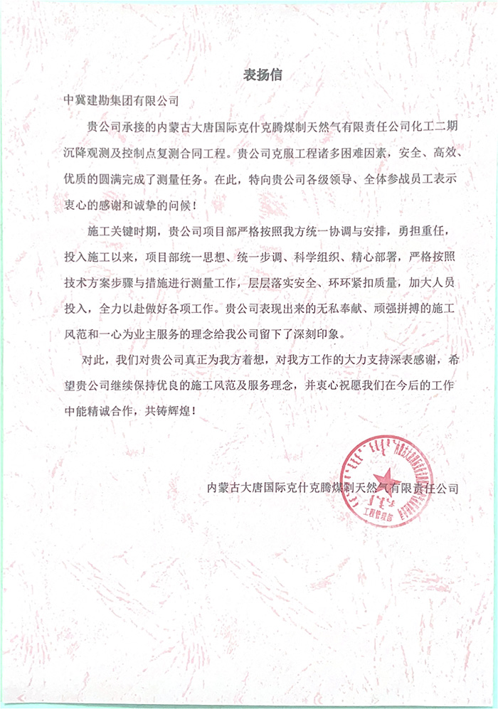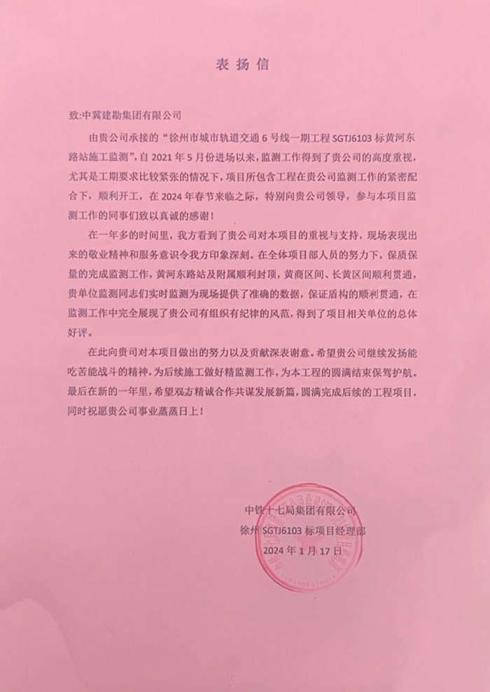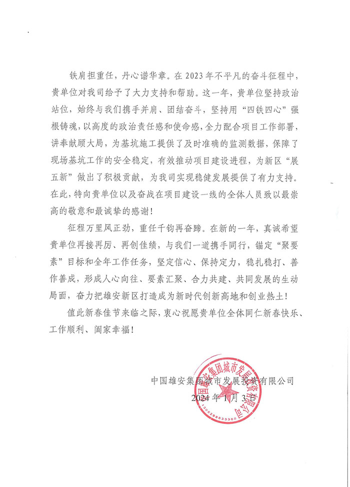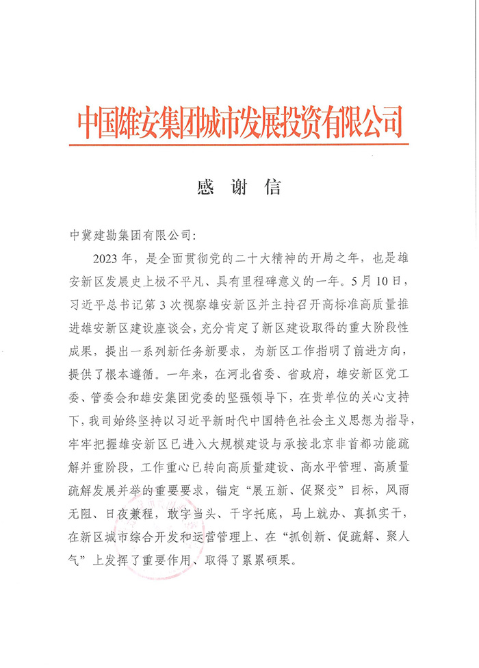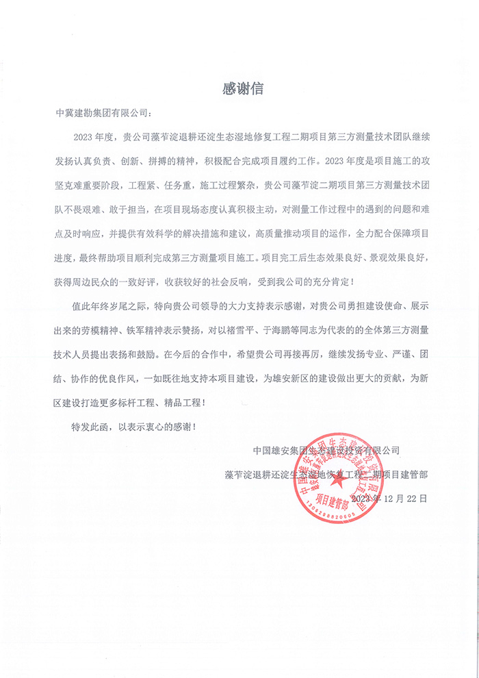 近期,公司陸續(xù)收到中國雄安集團城市發(fā)展投資有限公司、河北雄安軌道快線有限責(zé)任公司、中國雄安集團生態(tài)建設(shè)投資有限公司、中鐵五局、中鐵十七局、鄭州地鐵集團、內(nèi)蒙古大唐國際克什克騰旗煤制天然氣電廠、大唐內(nèi)蒙古多倫電廠等業(yè)主單位發(fā)來的感謝信。我公司認真負責(zé)、敢打能打硬仗的工作態(tài)度、頑強拼搏的施工風(fēng)范和一心為業(yè)主服務(wù)的理念,贏得了業(yè)主的高度認可和贊揚,特發(fā)來感謝信深表感謝!