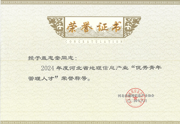 近期,由河北省地理信息產(chǎn)業(yè)協(xié)會評選,我公司被授予第五屆理事會“先進工作單位”榮譽稱號和2022-2023年度河北省地理信息產(chǎn)業(yè)“十佳單位”榮譽稱號,蓋忠奎同志榮獲2024年度河北省地理信息產(chǎn)業(yè)“優(yōu)秀青年管理人才”稱號。