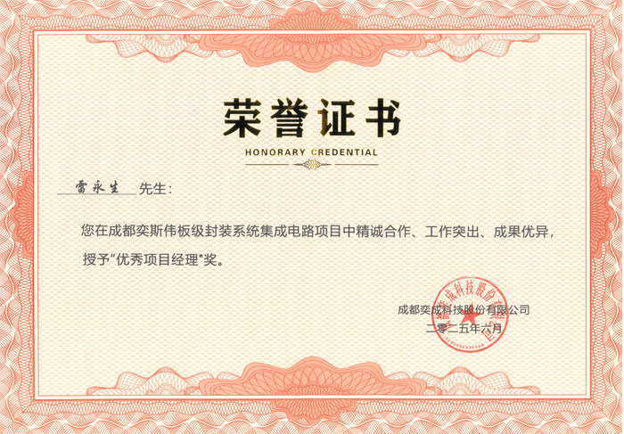 近日,我集團公司榮獲成都奕成科技股份有限公司“優秀承包商”榮譽,項目經理雷永生被授予“優秀項目經理”。