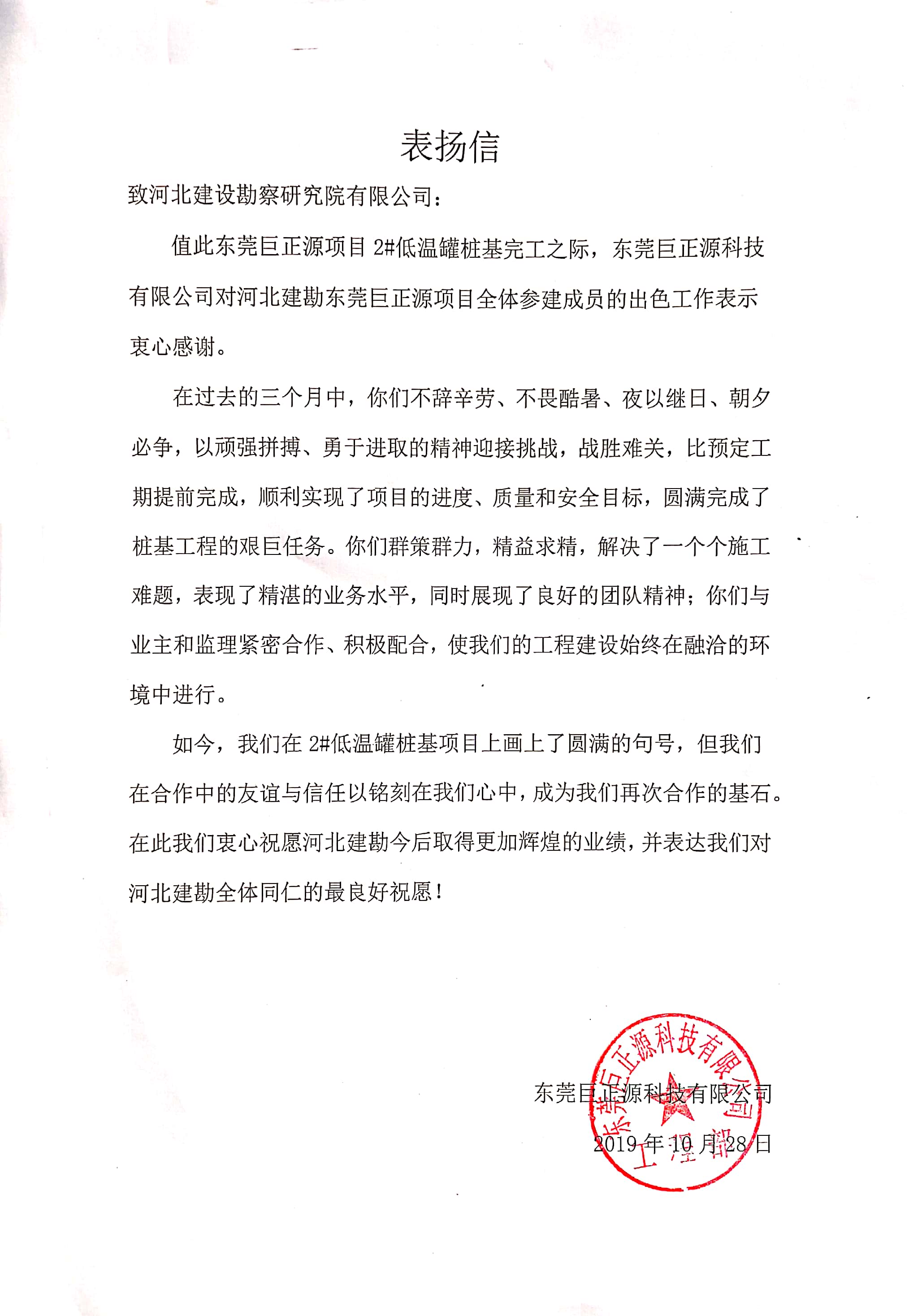 公司收到東莞巨正源科技有限公司表揚信