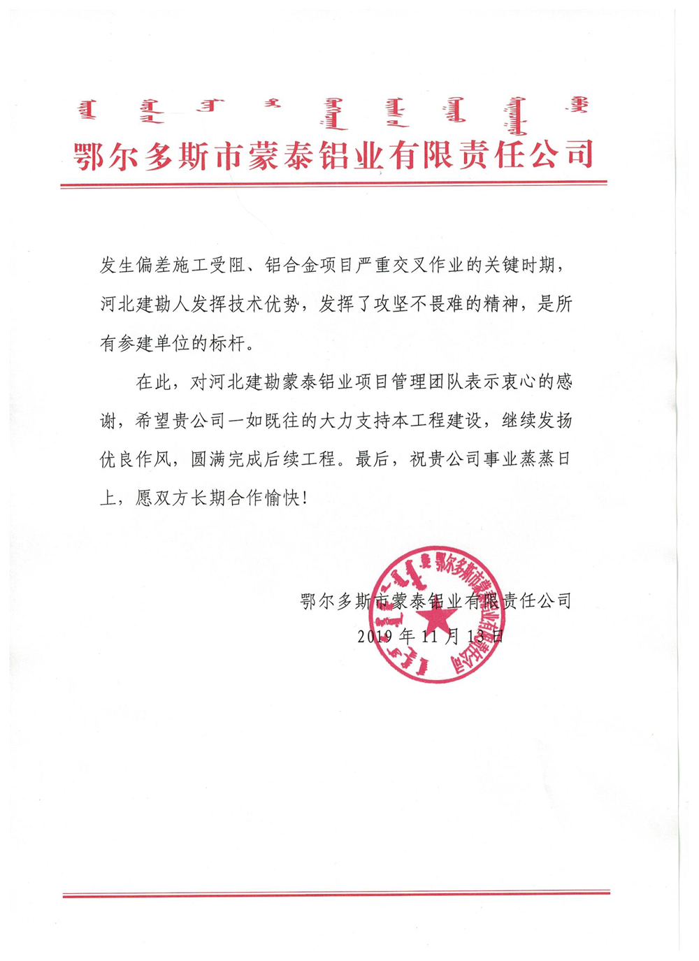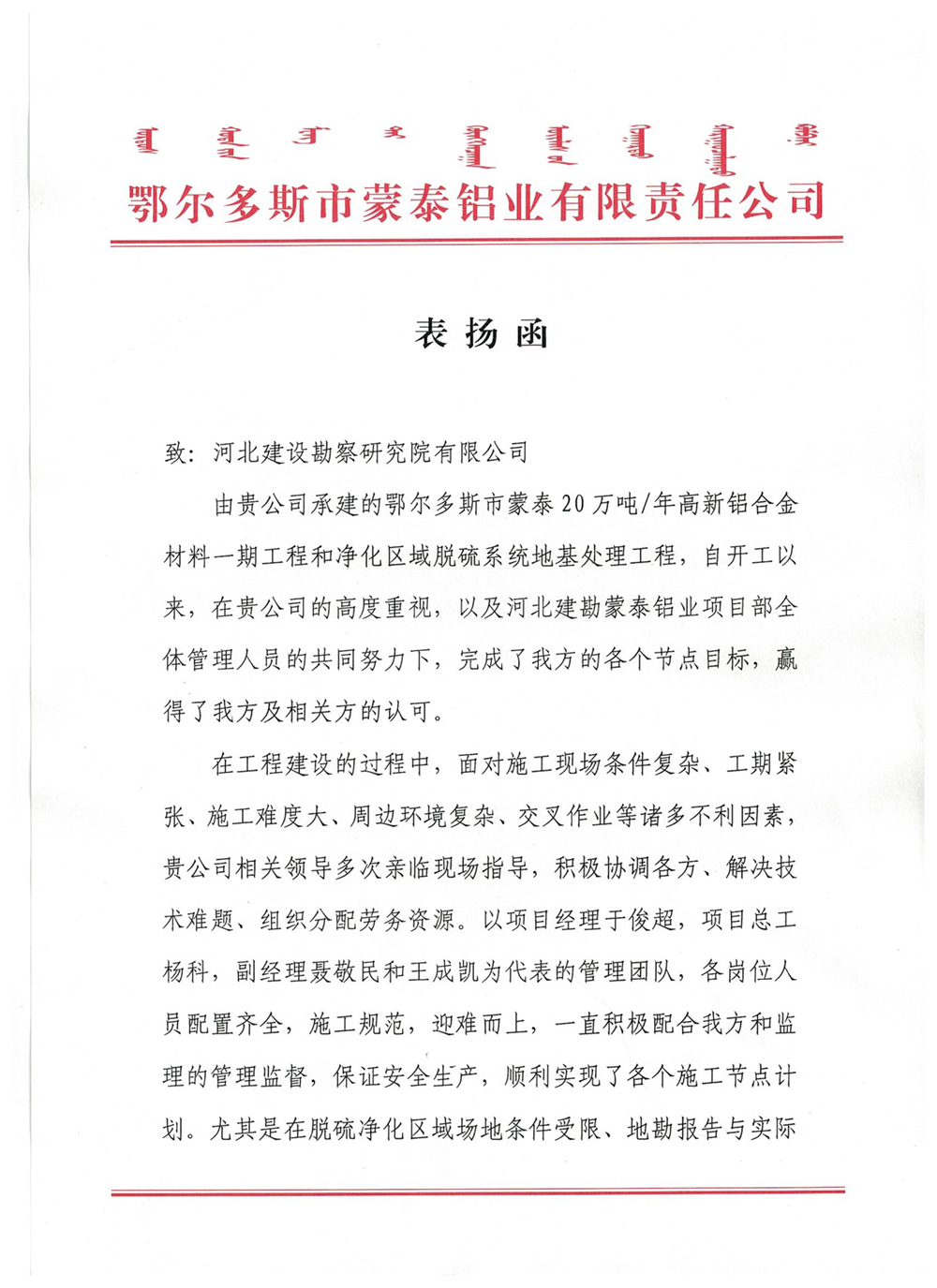近日,鄂爾多斯市蒙泰鋁業有限責任公司發來的表揚函,對我項目部負責施工的鄂爾多斯蒙泰20萬噸/年高新鋁合金材料一期工程和凈化區域脫硫系統地基處理工程在施工過程中的優異表現予以表揚。