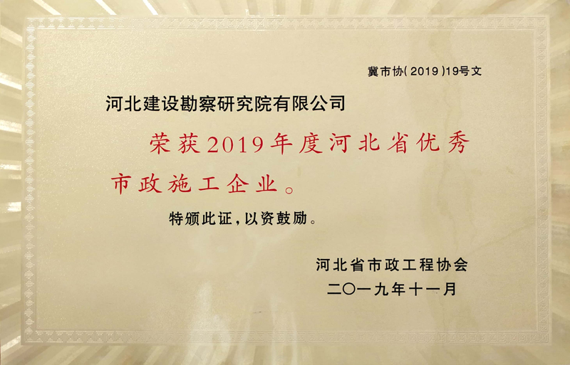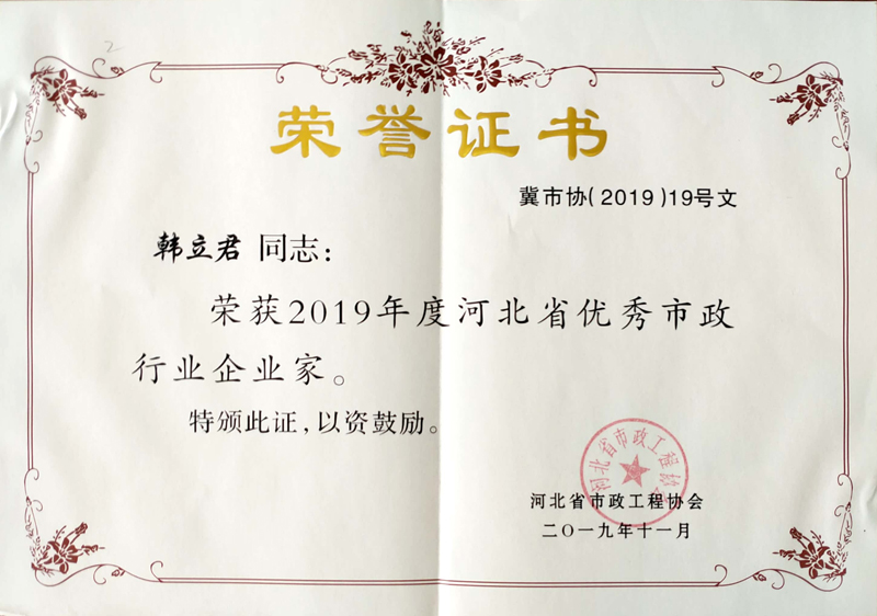 近日公司被河北省市政工程協會評為“2019年度河北省優秀市政施工企業”;公司董事長韓立君同志獲評“2019年度河北省優秀市政行業企業家”。