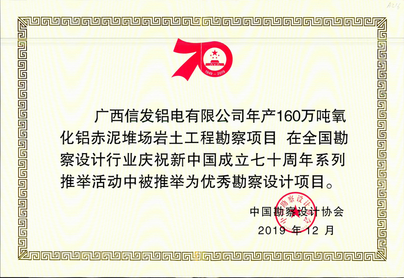 其中,我公司榮獲“優(yōu)秀勘察設(shè)計(jì)企業(yè)”榮譽(yù)稱號(hào),董事長(zhǎng)韓立君榮獲“優(yōu)秀企業(yè)家”稱號(hào),總工程師聶慶科榮獲“科技創(chuàng)新帶頭人”榮譽(yù)稱號(hào)。我公司完成的張家口腰站堡水源地(15萬(wàn)噸/日)供水水文地質(zhì)勘察項(xiàng)目、廣西信發(fā)鋁電有限公司年產(chǎn)160萬(wàn)噸氧化鋁赤泥堆場(chǎng)巖土工程勘察項(xiàng)目被推舉為優(yōu)秀勘察設(shè)計(jì)項(xiàng)目。