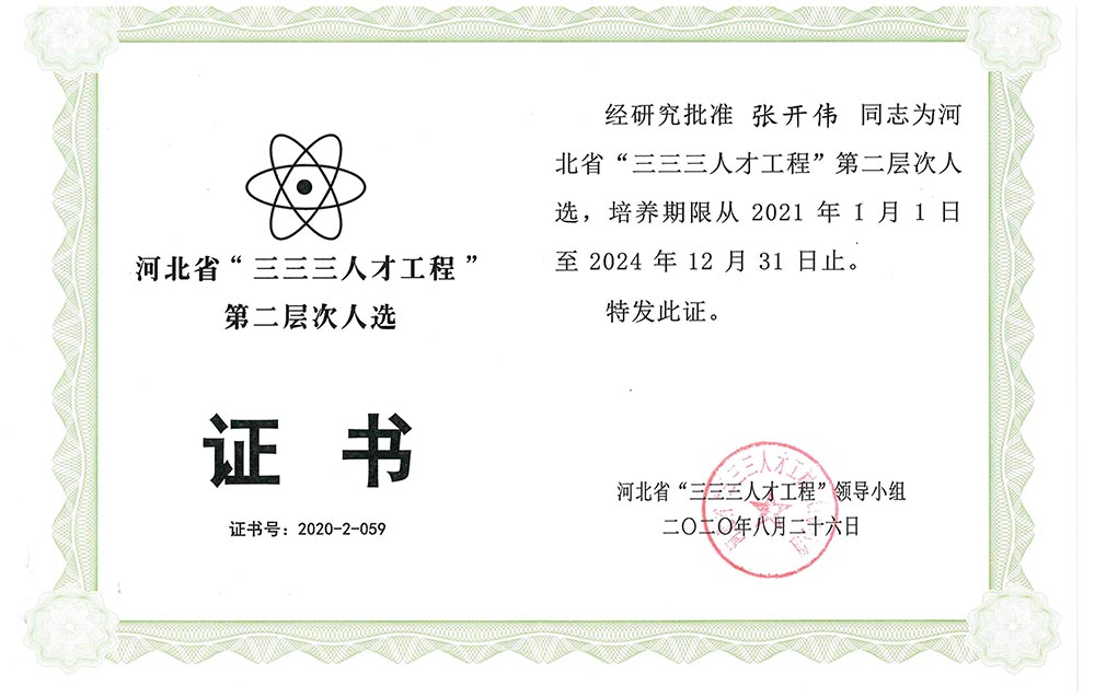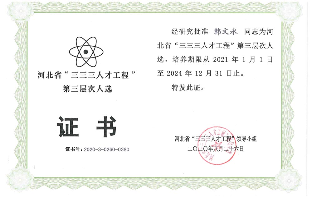 經公司申報、石家莊市人力資源和社會保障局推薦,河北省“三三三人才工程”領導小組批準,公司張開偉同志榮獲2020年度河北省“三三三人才工程”第二層次人選,韓文永、孫廣兩名同志榮獲2020年度河北省“三三三人才工程”第三層次人選。
