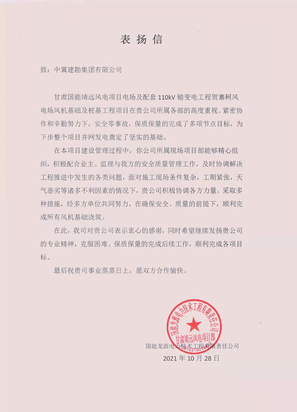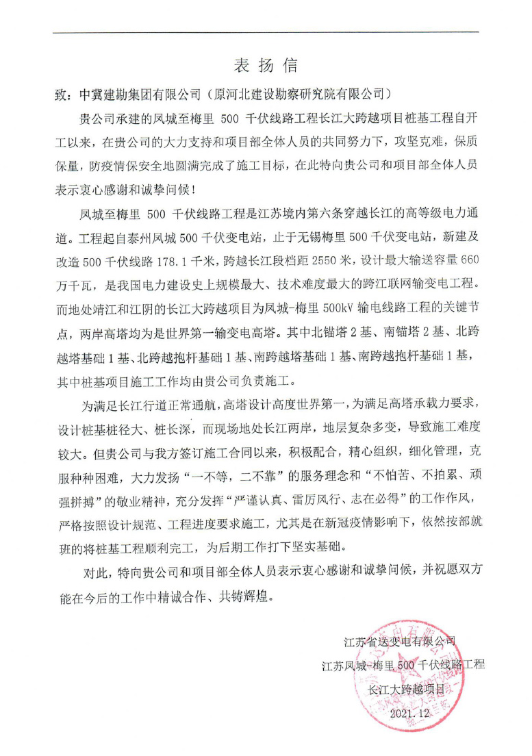 江蘇鳳城梅里500千伏線路工程長(zhǎng)江大跨越項(xiàng)目樁基工程,甘肅國(guó)能靖遠(yuǎn)風(fēng)電項(xiàng)目電場(chǎng)及配套110KV輸變電工程賀寨柯風(fēng)電場(chǎng)風(fēng)機(jī)基礎(chǔ)及樁基工程項(xiàng)目業(yè)主向我公司發(fā)來(lái)表?yè)P(yáng)信,并頒發(fā)了“進(jìn)度、質(zhì)量管理先進(jìn)單位”榮譽(yù)證書,同時(shí),武衛(wèi)新、朱凱云、黃長(zhǎng)楠被評(píng)為“優(yōu)秀項(xiàng)目管理者”榮譽(yù)稱號(hào)。