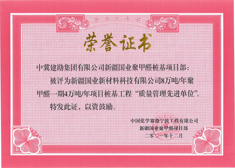 新疆國(guó)業(yè)新材料科技有限公司8萬(wàn)噸/年聚甲醛一期4萬(wàn)噸/年項(xiàng)目樁基工程榮獲“質(zhì)量先進(jìn)單位”。