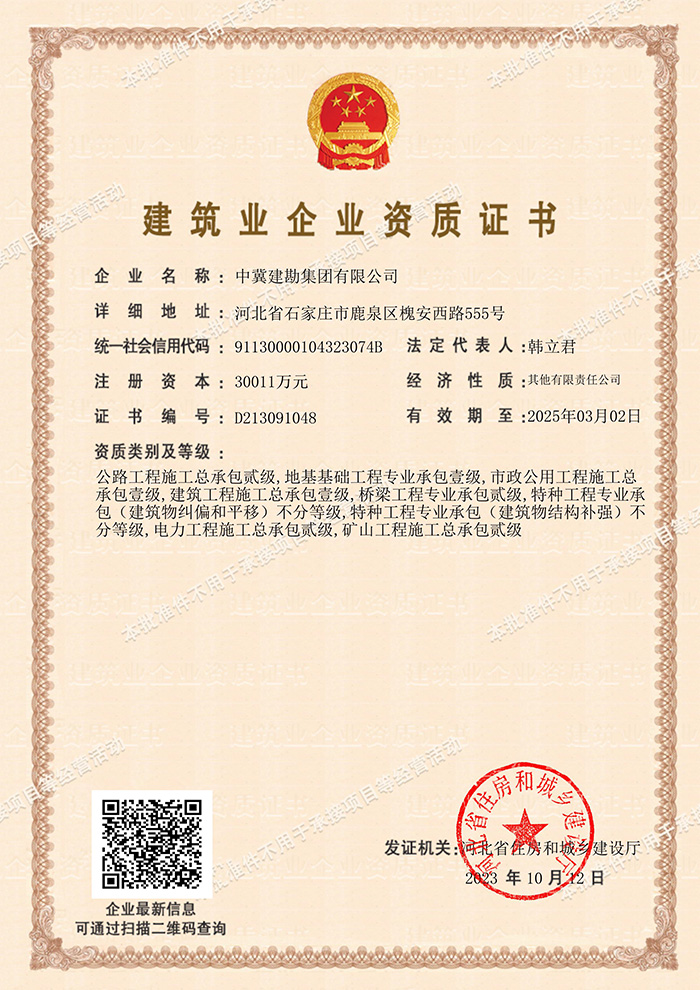 為拓展公司業務范圍,在公司領導的精心策劃下,經過安全生產部的不懈努力,集團公司于2023年10月12日經河北省交通廳、河北省住建廳審核批準,成功取得了公路工程施工總承包貳級資質,該資質的取得將為集團公司拓展縣、鄉、村公路工程業務提供了先決條件,為增強地方市場的開拓能力、提高地方市場競爭力提供有力支撐,將在助力集團公司高質量發展、升級轉型上貢獻更大力量。