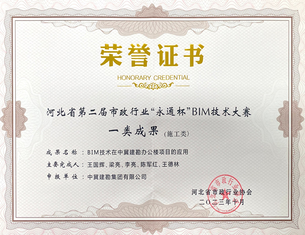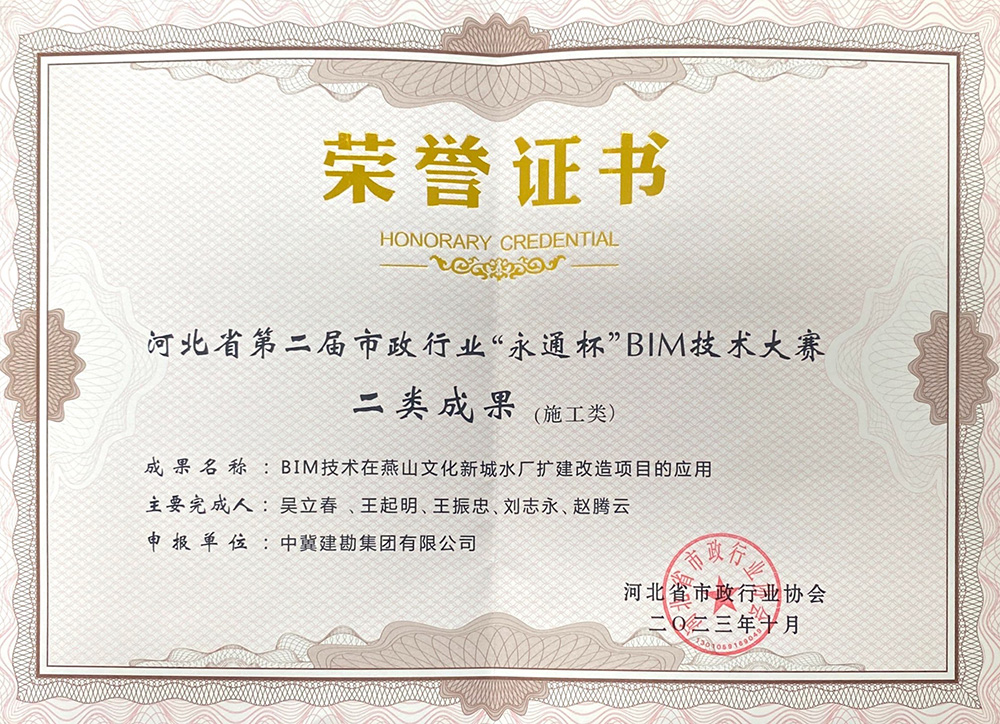 近日,河北省市政行業(yè)協(xié)會發(fā)文《關于公布河北省市政行業(yè)第二屆“永通杯”BIM技術應用大賽結果的通知》(冀市協(xié){2023}37號),我公司參賽項目“BIM技術在中冀建勘辦公樓項目的應用”項目榮獲一類成果、“BIM技術在燕山文化新城水廠擴建改造項目的應用”項目榮獲二類成果。