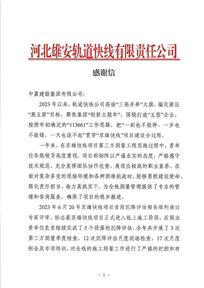 近期,公司陸續(xù)收到中國雄安集團城市發(fā)展投資有限公司、河北雄安軌道快線有限責(zé)任公司、中國雄安集團生態(tài)建設(shè)投資有限公司、中鐵五局、中鐵十七局、鄭州地鐵集團、內(nèi)蒙古大唐國際克什克騰旗煤制天然氣電廠、大唐內(nèi)蒙古多倫電廠等業(yè)主單位發(fā)來的感謝信。我公司認真負責(zé)、敢打能打硬仗的工作態(tài)度、頑強拼搏的施工風(fēng)范和一心為業(yè)主服務(wù)的理念,贏得了業(yè)主的高度認可和贊揚,特發(fā)來感謝信深表感謝!