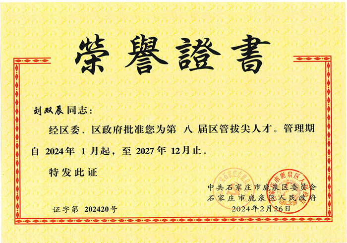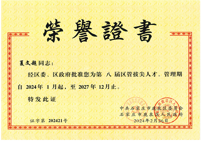 經公司組織申報,中共石家莊市鹿泉區委員會組織資格審核、綜合評審、征求意見、實地考察、區委常委會議研究等程序,我公司夏文超、劉雙辰入選石家莊市鹿泉區第八屆拔尖人才。