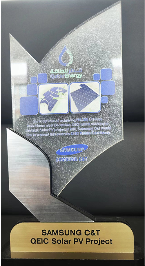 我公司收到卡塔爾能源875.5MW光伏發(fā)電項(xiàng)目業(yè)主方卡塔爾能源和總包方三星C&T公司聯(lián)合頒發(fā)的獎(jiǎng)杯和推薦信。業(yè)主及總包方高度認(rèn)可我公司項(xiàng)目履約能力,贊揚(yáng)我司對(duì)該項(xiàng)目成功交付做出重大貢獻(xiàn),表示愿意與我司建立長(zhǎng)期合作關(guān)系?;谖宜咀吭降穆募s表現(xiàn),三星C&T公司授予我司推薦信。