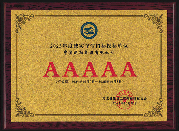 近日,我公司被河北省建設工程招標投標協會評為2023年度河北省建設工程招標投標誠實守信5A級施工企業。