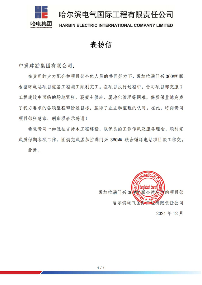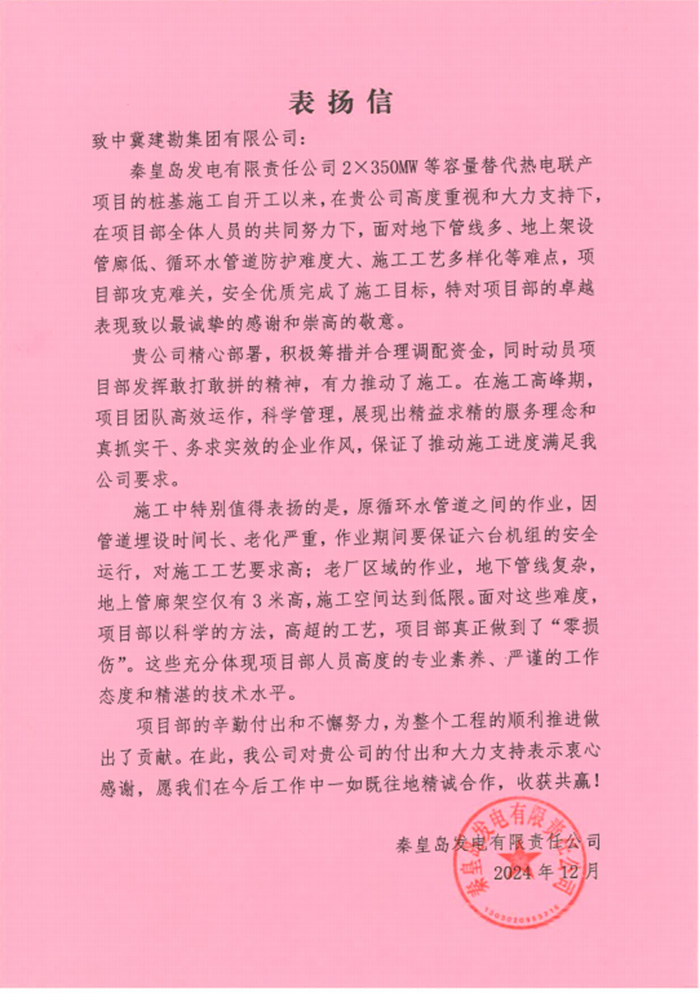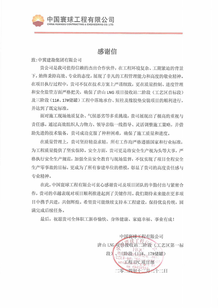 近期,一公司陸續收到國電電力秦皇島發電有限公司、中國寰球工程有限公司、中石化寧波工程有限公司、海洋工程股份有限公司、哈爾濱電氣國際工程有限公司等項目發的來感謝信、表揚信以及優秀承包商、優秀施工單位榮譽證書。繽紛而至的感謝信及榮譽證書不僅是對我們過去努力的肯定,更是對未來合作的美好期許,為公司的發展歷程增添了濃墨重彩的一筆。