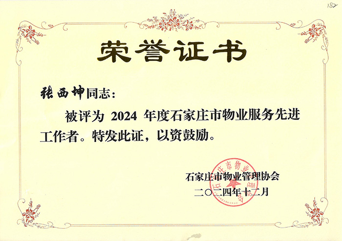 中冀建勘物業(yè)服務(wù)有限公司榮獲“2024年度石家莊市物業(yè)管理先進(jìn)單位”,張西坤同志榮獲“物業(yè)服務(wù)先進(jìn)工作者” 榮譽(yù)稱號(hào)。